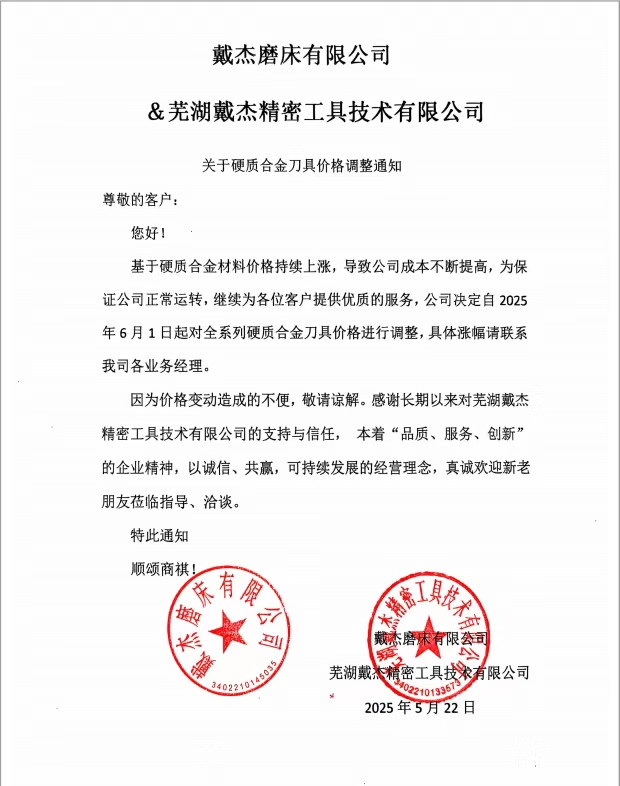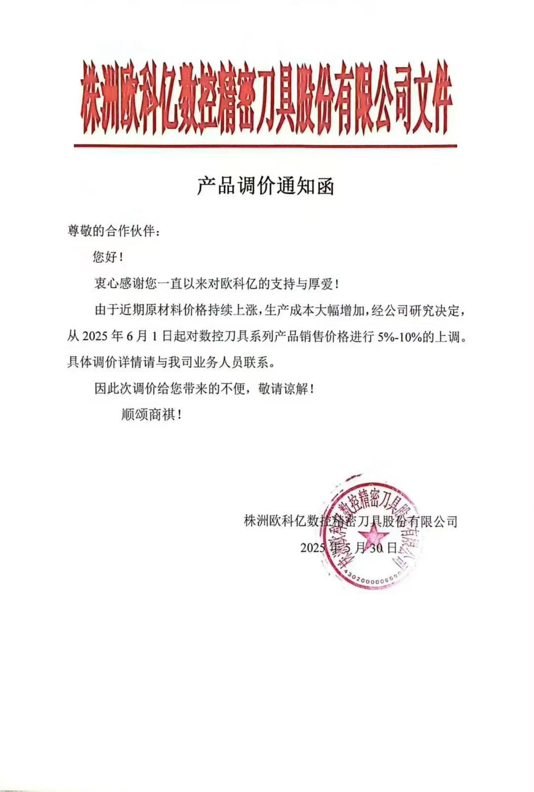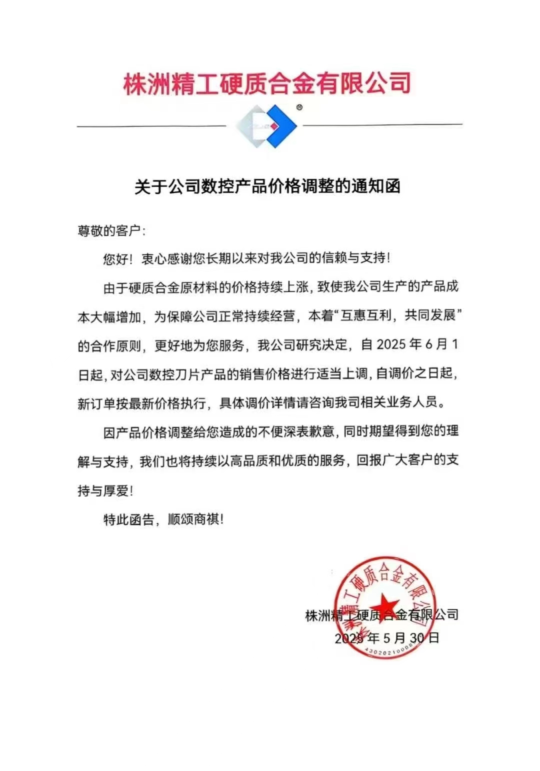 各大硬質(zhì)合金刀具生產(chǎn)商從2025年6月開始不約而同上調(diào)產(chǎn)品出廠價格,以應對成本上漲壓力。