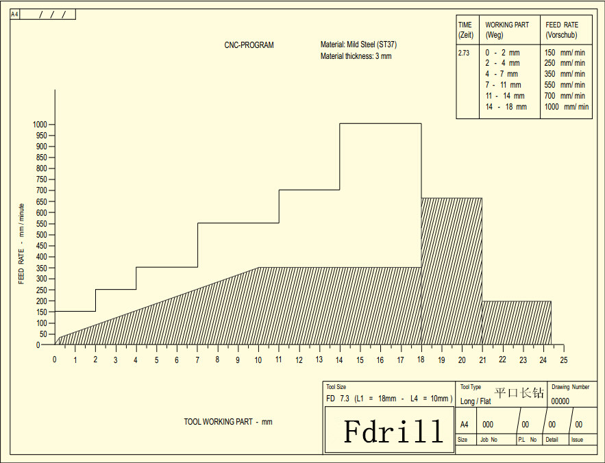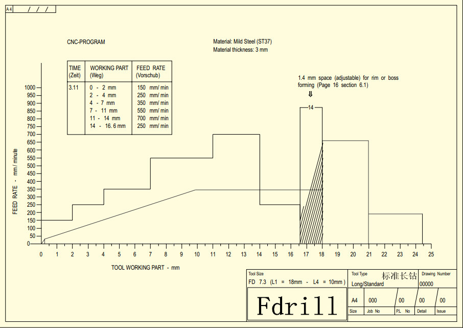 熱熔鉆孔加工的進(jìn)給速度由軸向壓力決定。在剛開始鉆孔所需軸向壓力很大;隨著材料慢慢受熱變軟,熱熔鉆頭慢慢穿透材料,所需壓力越小,進(jìn)給速度可以加快。采用NC或CNC數(shù)控設(shè)備加工時,進(jìn)給速度應(yīng)由慢變快。并且,進(jìn)給速度根應(yīng)根據(jù)熱熔鉆直徑大小、轉(zhuǎn)速、材 料材質(zhì)和厚度的不同而調(diào)整。正確的進(jìn)給速度可以根據(jù)簡單的試驗(yàn)和觀察來確定:最終目標(biāo)是在整個熱熔鉆孔過程中鉆頭要始終保持暗紅色。以下范例是M8(Ø7.3)標(biāo)準(zhǔn)長鉆和平口長鉆加工3mm中碳鋼的進(jìn)給參數(shù)。所有其他數(shù)控加工參數(shù)可根據(jù)需要提供。