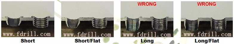熱熔鉆使用手冊(cè) Fdrill Manual:Do's & Don'ts1.熱熔鉆頭是由很脆的硬質(zhì)合金制成,容易斷裂,使用時(shí)須小心,不要掉落在地上,也不要用任何物品敲擊鉆頭。平口型熱熔鉆頭的刃口部分很較脆弱,請(qǐng)注意保護(hù)。2.被加工的工件材料要一直夾緊。3.確保采用推薦的主軸轉(zhuǎn)速。4.不要采用傳統(tǒng)冷卻液潤(rùn)滑熱熔鉆頭。這樣可能導(dǎo)致熱熔鉆斷裂,必須使用熱熔鉆頭專(zhuān)用的熱熔膏。5.熱熔鉆頭不要停留在孔的底部。一旦孔鉆好后,就要立即將熱熔鉆頭移出。否則,當(dāng)孔冷卻收縮后,可能導(dǎo)致鉆頭被卡住或斷裂。6.剛鉆好的工件材料部位會(huì)很燙,操作時(shí)要當(dāng)心。7.要配帶護(hù)目鏡。8.鉆床主軸不穩(wěn)定會(huì)造成鉆頭傷害,不要再鉆不完整的孔,因孔已收縮。同一孔因故未完成,不可再行鉆孔,必須放棄。 9.不要用長(zhǎng)鉆來(lái)鉆薄的材料。加工很薄的材料建議采用標(biāo)準(zhǔn)短鉆或平口短鉆,這樣可以得到更好的加工效果。注意看下圖(圖中壁厚都一樣)10.不要將潤(rùn)滑劑添加在工件材料上,熱熔膏必須涂在熱熔鉆頭工作部位上。11.在鉆孔過(guò)程的任何時(shí)間點(diǎn)上,都不要停止運(yùn)轉(zhuǎn)。12.平口型熱熔鉆頭鉆孔時(shí)有一條小切削,要做好保護(hù)。13.確保熱熔鉆頭旋轉(zhuǎn)的方向是否正確。